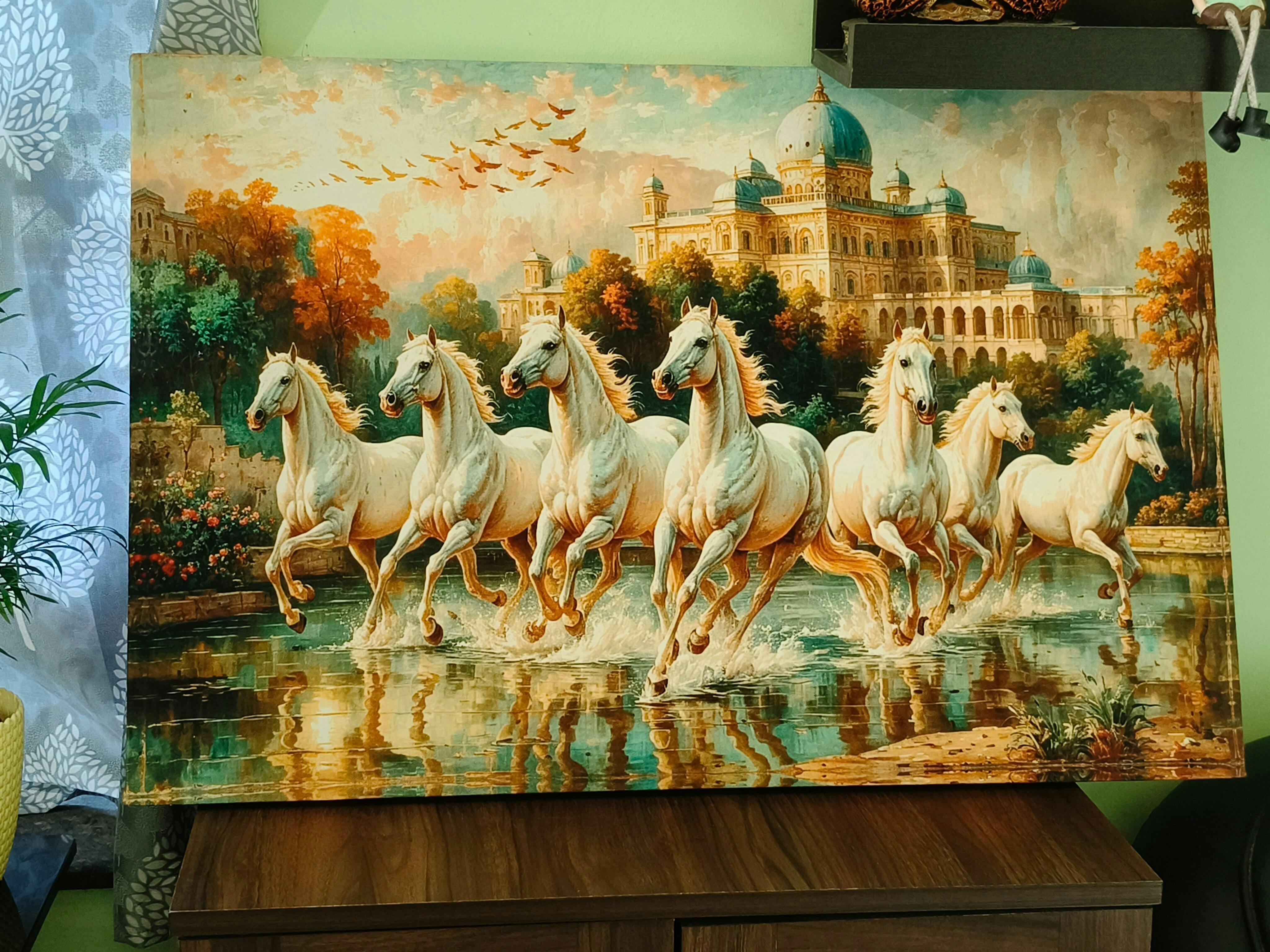 - Features seven white running horse painting with peaceful expressions, symbolizing strength and success.