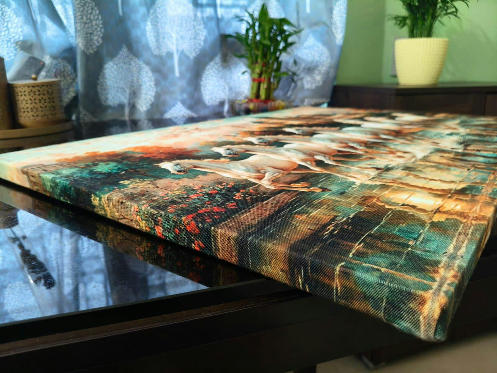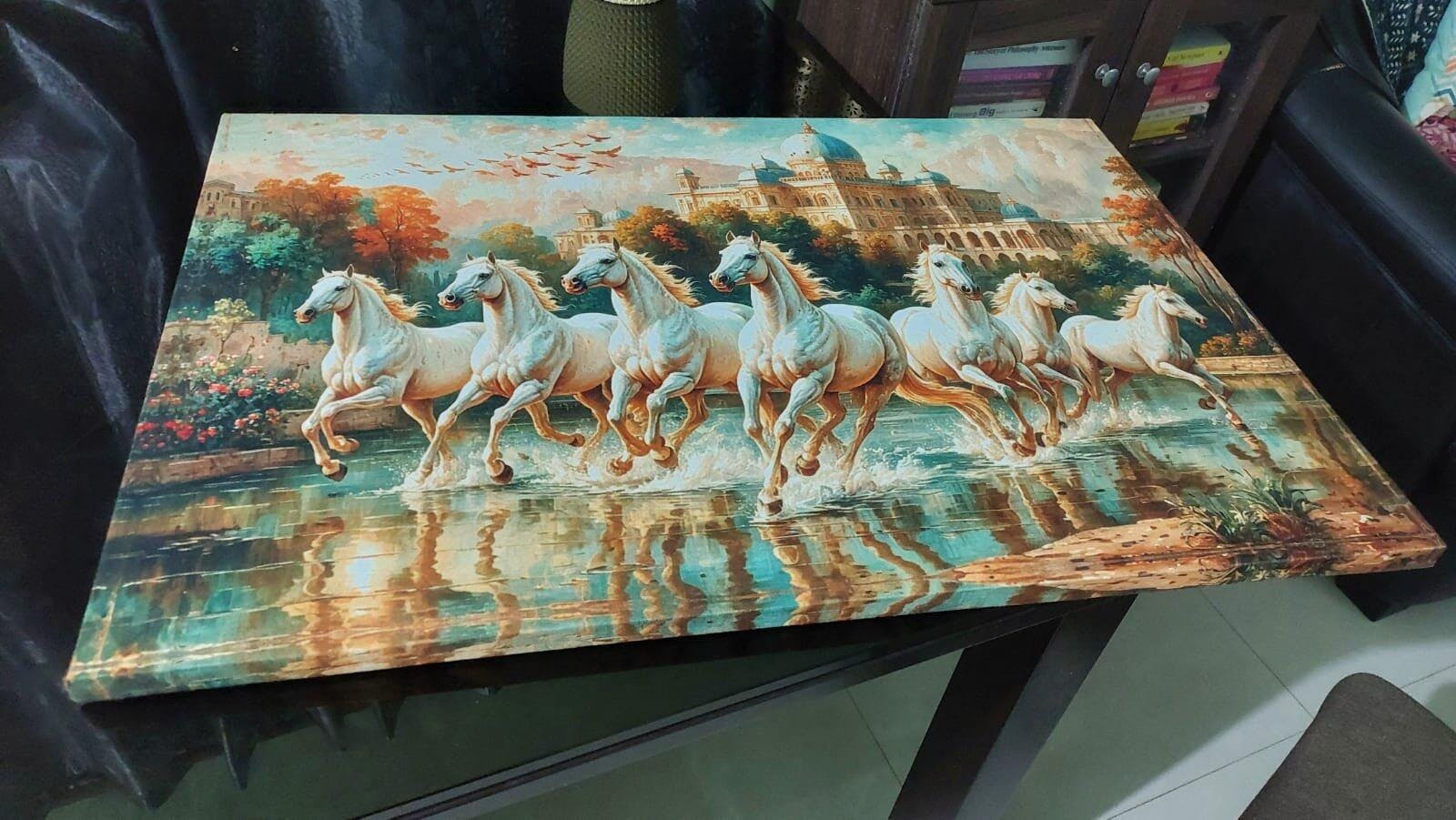 - 7 Horse Canvas Painting (20x30 inches): Made from PolyCanvas fabric with a sturdy white wooden frame, using OEKO-TEX certified inks and fade-proof sublimation printing, ideal for gifting.
